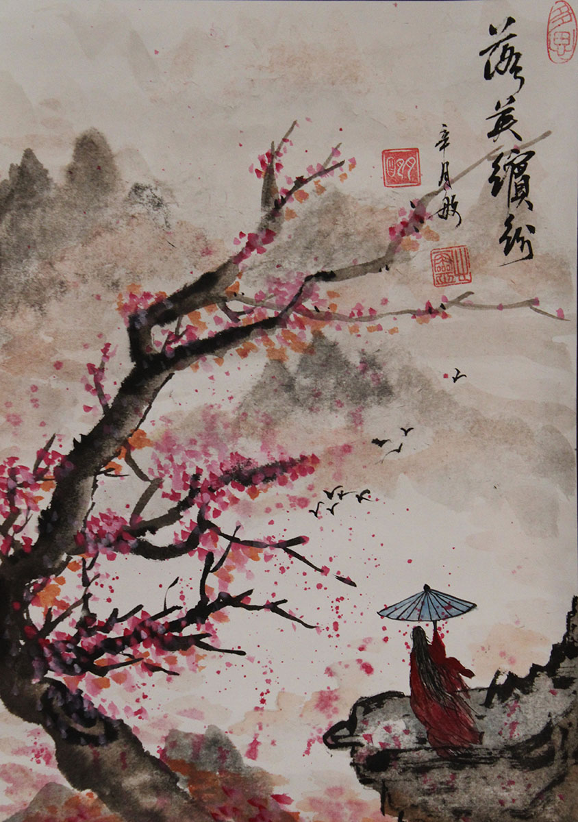 Yuemin Xin was born in Hulunbuir, Inner Mongolia in China. Her original art designs are hand painted on rice paper with ink and water, utilizing Qing Dynasty era techniques.